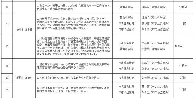 根据方案,我市在2022年通过加强富硒土壤资源保护与开发利用,发挥首批富硒产业示范基地带动作用,新建高标准富硒产业示范基地50个以上;按照“扩大总量、提档升级、特色鲜明、示范带动”的总体要求,结合富硒农业产业发展实际,集中优势资源,推动建设18个高标准富硒产业园区;突出绿色有机富硒农业资源优势,出台奖补政策,重点培育30个集生产、加工、销售和三产融合于一体的富硒农业示范龙头企业;完成赣州市富硒农业与产品开发技术创新中心、赣南富硒研究院建设,启动富硒功能产品研发、富硒功能农业大数据中心建设,开展硒与动物和人体健康国际计划合作研究,不断提高新技术、新产品示范推广能力和科研成果转化率,通过硒科技创新驱动硒产业高质量发展;组织富硒农产品参加各地展示展销活动,推广赣南富硒;实施强农战略,引进策划公司对赣南富硒进行整体包装策划等内容,做好硒资源的有效保护和合理利用工作。